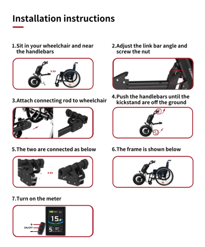 Az Elesmart A8 gyorsan és minimális erőfeszítéssel felszerelhető. A rögzítő rendszer közvetlenül a kerekesszékhez igazodik, és biztosítja a stabil, funkcionális csatlakozást anélkül, hogy akadályozná a lábtér használatát.